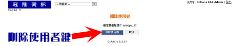 1.請先登入傳真伺服器管理後台介面主畫面,再於所有使用者的清單中點選欲刪除的使用者。 2.即可至更改傳真帳號的畫面,請點選刪除使用者鍵,後會切換至詢問確定要刪除此使用者的畫面,請再點選刪除使用者鍵既完成刪除傳真使用者的動作。下方是各欄位的詳細說明。