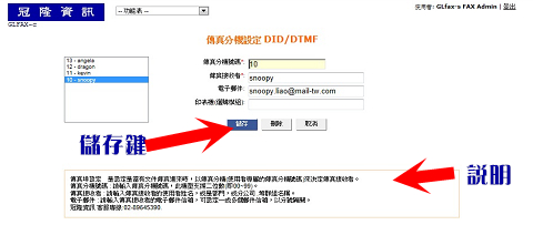 1.請先登入傳真伺服器管理後台介面主畫面,再於功能表選單中挑選傳真分機設定選項。 2.即可至傳真分機設定的畫面,請先點選欲設定傳真分機的使用者,再於傳真分機號碼欄位內輸入數字(依機型的不同而有不同的位元數),並適當地設定傳真接收者與電子郵件欄位,當各欄位輸入完成後,請點選儲存鍵既完成使用者傳真分機設定的動作。下方是各欄位的詳細說明。